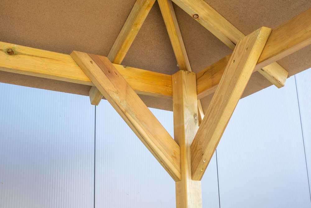 De doorloophoogte van Prieel Cordoba is 199 cm en de dakoverstek bedraagd 34 cm. Prieel Cordoba wordt standaard geleverd met houten dakplaten van 16 mm met bitumen dakbedekking als eerste deklaag. Deze houten overkapping voor uw tuin is tevens uit te breiden met dakshingles (meerprijs). Kijk bij de extra opties voor het bestellen van verschillende soorten dakshingles (sterk aanbevolen). Kies bijvoorbeeld uit Dakshingles Recht in de kleur zwart, of Dakshingels Beverstaart in de kleur groen.