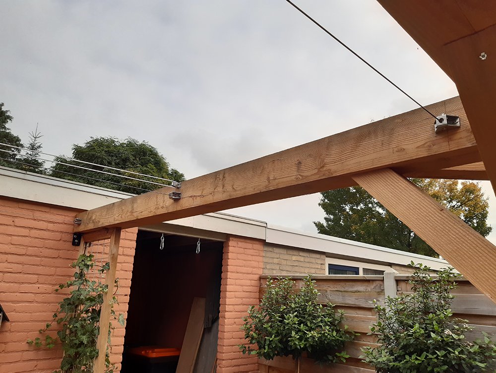 U monteert het doek eenvoudig aan de bijgeleverde stalen kabels. U kunt het schuifdoek handmatig open- en dicht schuiven met een trekkoord. Start direct na levering met de montage dankzij de meegeleverde bevestigings en bedieningsmaterialen.